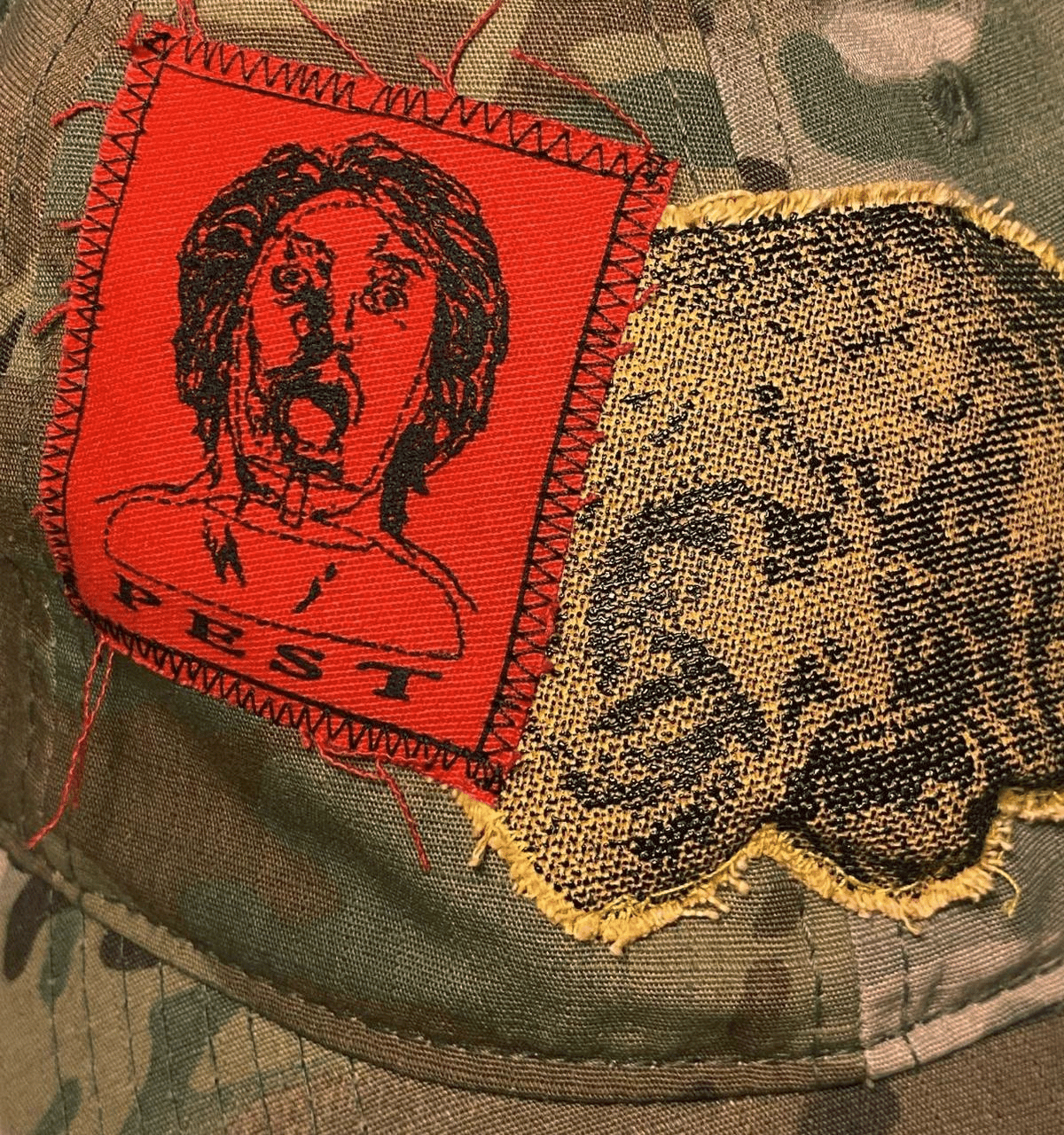 Blend in and stand out at the same time. Hand screen printed patchwork sewn onto classic military-grade ripstop camouflage; this hat is made to last, and turn heads.