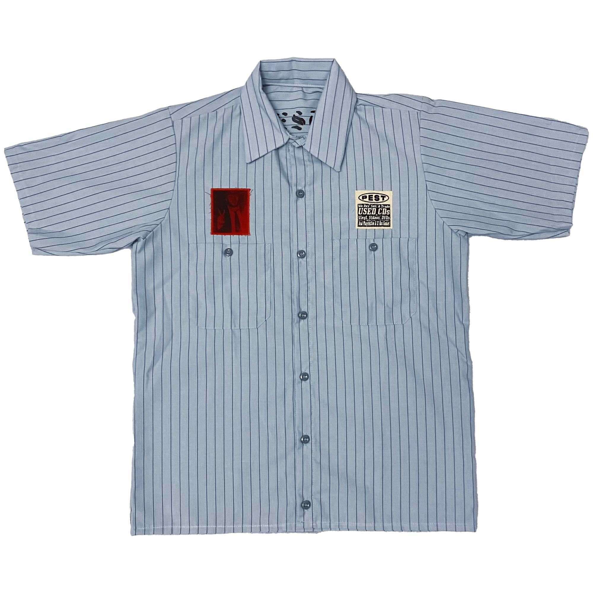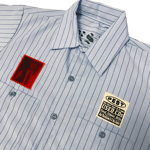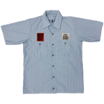 Custom tailored cropped work shirt. Get dirty, or look fresh in this striped baby blue button down. Sure to be a statement piece in your wardrobe.